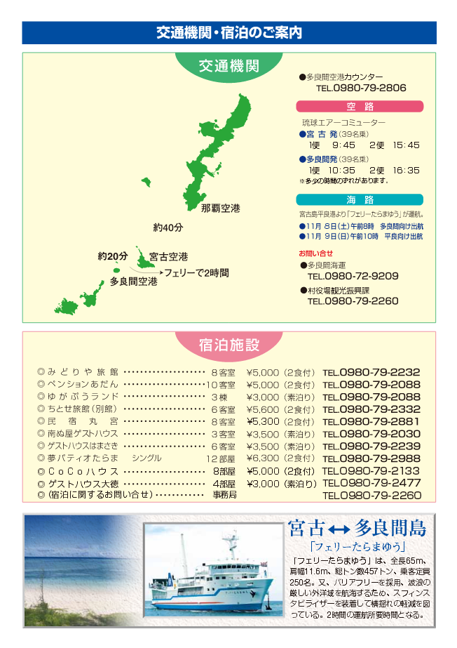 多良間海運 Tel:0980-72-9209 - * 多良間空港からオンデマンドバス約10分、または「前泊港」からオンデマンドバス約5分。