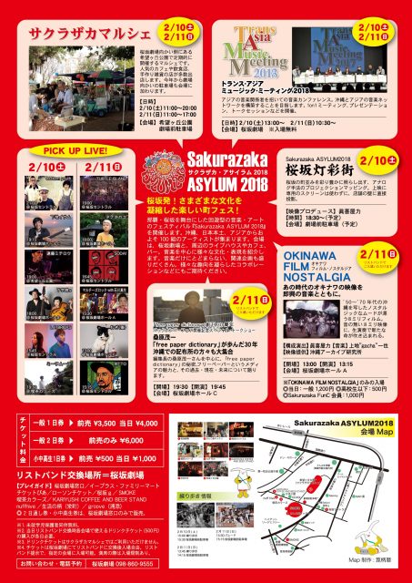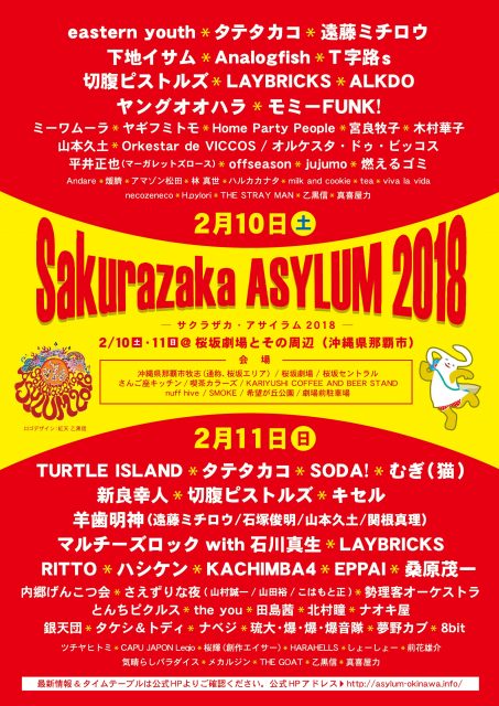 2018年2月10日(土)・11日(日)の2日間、 那覇市にある桜坂劇場とその周辺を会場に、「Sakurazaka ASYLUM 2018」が開催されます。沖縄をはじめ日本本土、そしてアジアから約100組のアーティストが出演する音楽&アートのイベントです。