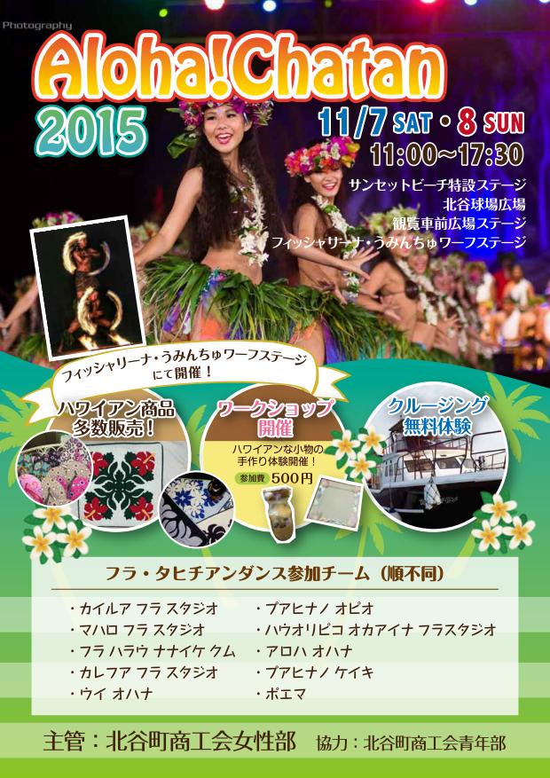 「C-1ちゃたんグルメバトル」「フラ・タヒチアンダンス」「星空上映会」「北谷&ハワイ物産展」が同時展開! これらのイベントを総称して「アロハ北谷2015」として開催。美浜エリアがハワイに染まる2日間です! -