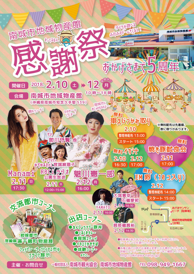 また、キッズ達のために、ふわふわ遊具を無料開放。ちびっこ達は遊び放題です! - 西原町のアンダギー、沖縄市のエイ坊、宜野湾市のコルネ、嘉手納町の野國いもっち、北谷町の北谷の塩、北中城村の北のべーちん、中城村の護佐丸、読谷村のよみとんはるさー、うるま市のウルマーなど、中部広域の名産品、特産品、推奨品、そしてゆるキャラが登場!