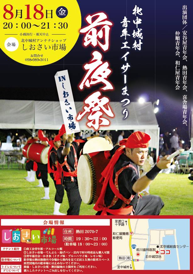 2017年8月18日(金)19:30~22:00にかけては、しおさい市場前にて前夜祭が催されます(主催:北中城村青年連合会)。