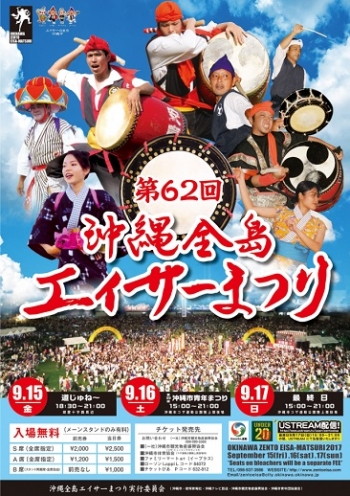 - 2017年9月17日(日)15:00~21:00 最終日 全島エイサーまつり(沖縄市コザ運動公園陸上競技場)