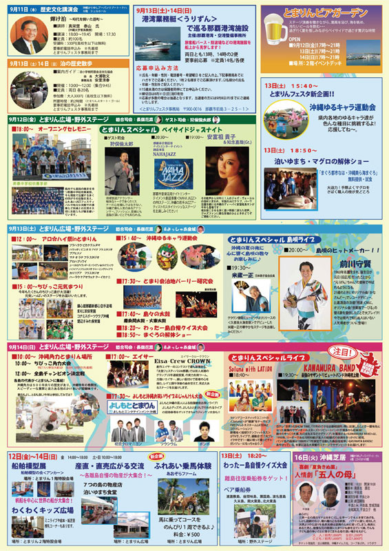 とまりん広場にて、アロ*ハイ祭inとまりん、ちびっこ元気祭り、沖縄ゆるキャラ運動会、島々の太鼓、離島往復乗車券がゲットできる「わったー島自慢クイズ大会」、まぐろの解体ショー、とまりんスペシャル 島唄ライブ、他。 -