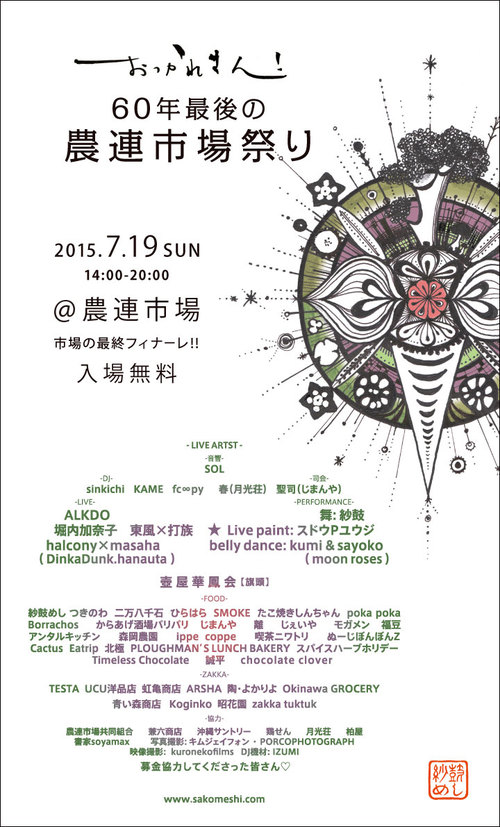 那覇市の第一牧志公設市場近くにあり、「県民の食の台所」と呼ばれて地元の人に愛され続けてきた農連市場(農連中央市場)が2015年8月に再開発されます。昭和28年から60年続いた農連市場の歴史に幕が下りるに当たって、「おつかれさん!農連市場祭!!」が開催!